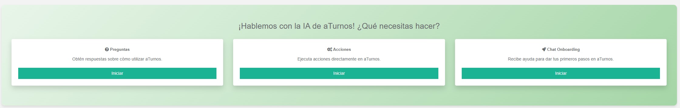 Este widget muestra la IA de aTurnos, es un widget que te asiste en tu recorrido por aTurnos. Tiene tres acciones: Hacer preguntas, pedirle que realice acciones por ti o, si es tu primera vez utilizando aTurnos, utilizando la acción “Chat onboarding” te va guiando paso a paso como si fuera una formación sobre lo que necesitas hacer para empezar a utilizar aTurnos.