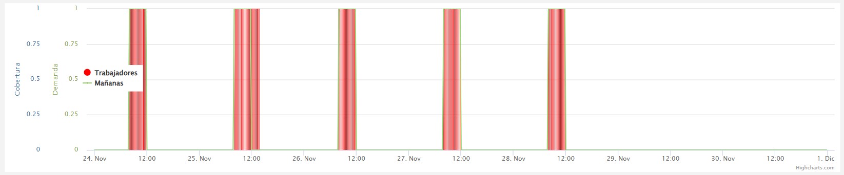 Muestra en un gráfico las demandas entre las fechas que aparecen en el eje horizontal de la gráfica, así como los trabajadores ajustados a esas demandas, en la misma gráfica mostrada como una línea de otro color.Visible para: Administradores.