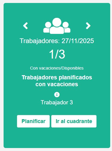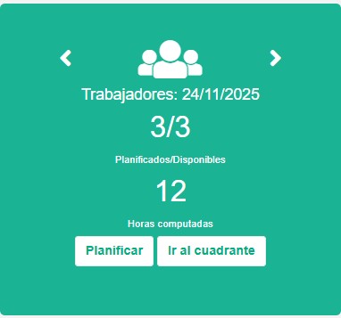 Indica cuántos trabajadores del equipo están planificados hoy con respecto al número de trabajadores total. Además tiene unos botones de acceso directo para ir al cuadrante y planificar .Visible para: Superusuario y todos los adinistradores.