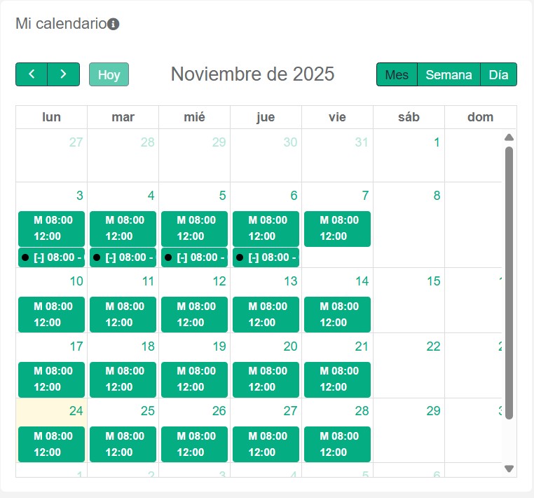Muestra un resumen del cuadrante con turnos, horas, absentismos, vacaciones, comentarios, festivos y recursos del usuario. Permite ver otros meses, así como vistas por semana o día. Visible para: Usuarios planificables.
