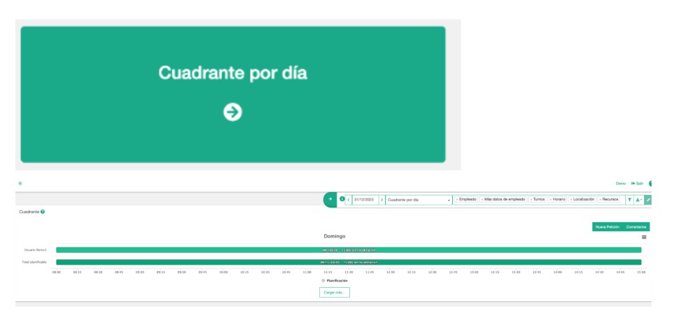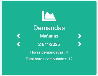 Permite la visualización en la pantalla de inicio de los trabajadores, las horas demandadas y el total de horas computadas de cada una de las demandas existentes, en la fecha seleccionada en el widget, así como la posibilidad de navegar entre fechas para ver las demandas asociadas a estas. Visible para: Administradores.