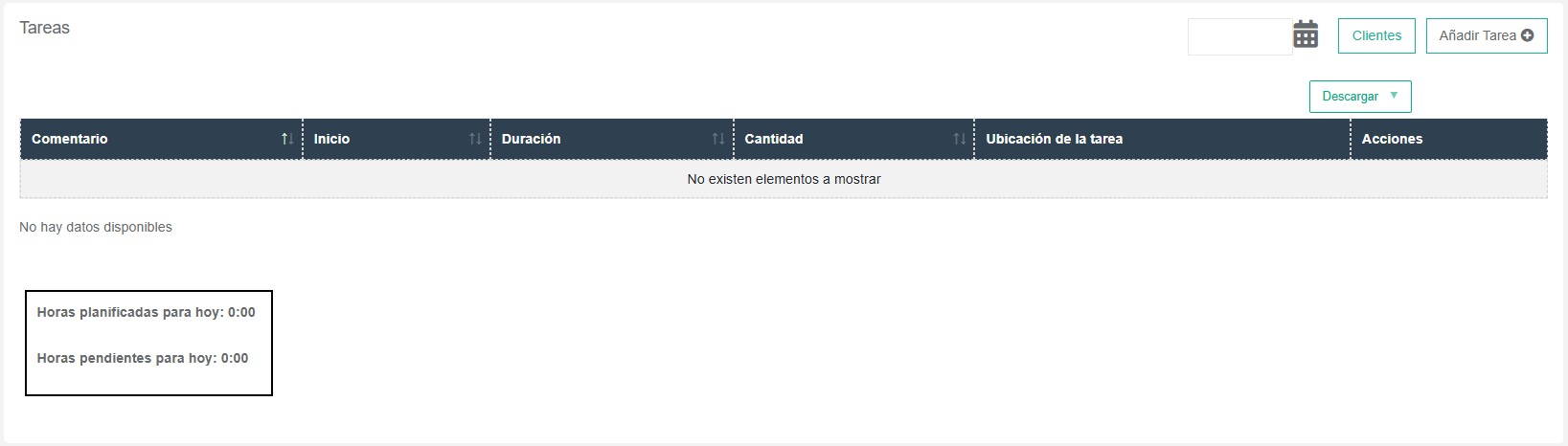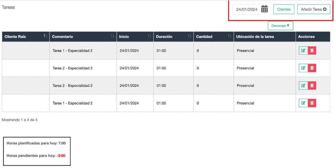 Muestra las tareas o citas planificadas en la fecha seleccionda a trabajador, así como el número de horas pendientes de asignar siendo la diferencia entre las horas planificadas menos las horas de las tareas asignadas, en el ejemplo el usuario tiene 3 horas pendientes de tareas.