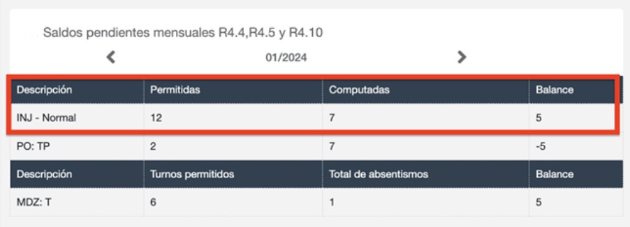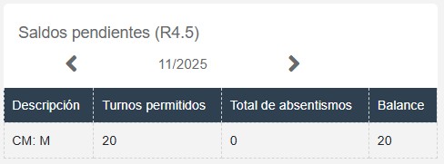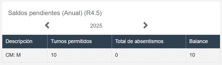 La restricción 4.5 limita que el número del tipo de absentismo planificado durante un año completo, no puede ser mayor al valor del tipo turno planificado de la restricción. El balance, en este widget, se realiza sobre la planificación del mes consultado. La consulta es mensual, pero el valor de la restricción es anual, de tal manera que a pesar de que en un mes el balance sea negativo, aún se puede planificar absentismos, esto es posible porque a nivel anual aún hay más turnos planificados que absentismos del tipo indicado en la restricción.