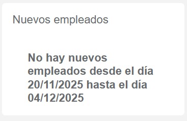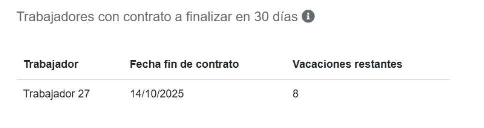 Este widget muestra el nombre de los trabajadores que en los próximos 30 días van a ser dados de baja. Muestra el nombre del trabajador cuyo contrato finaliza, la fecha de fin de contrato y las vacaciones que le quedan por disfrutar. Visible para: Trabajador, Validador y planificador