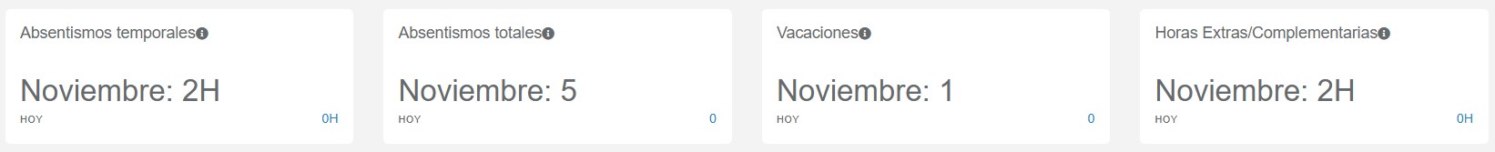 Este widget muestra las horas de absentismo y horas extra/complementarias, junto con el número total de absentismos y días de vacaciones del mes actual. También indica información del día en curso. Visible para: superusuarios y los administradores totales.