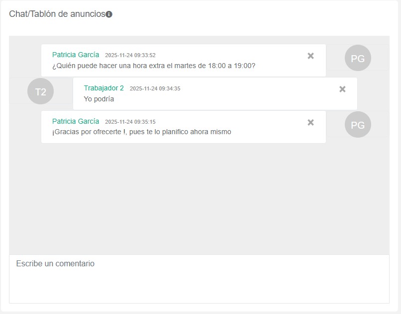 Este widget funciona como canal interno de comunicación del equipo. Permite publicar avisos y comentarios visibles según la configuración del equipo. Está disponible para todos los roles.