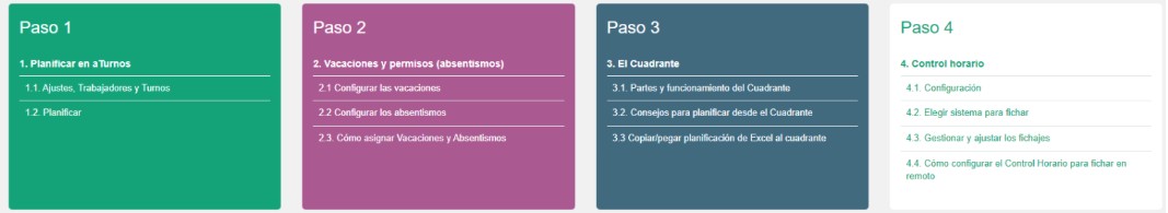 Muestra 4 pasos que guían al administrador de cómo empezar y configurar sus equipos en aTurnos. Visible para: Todos.