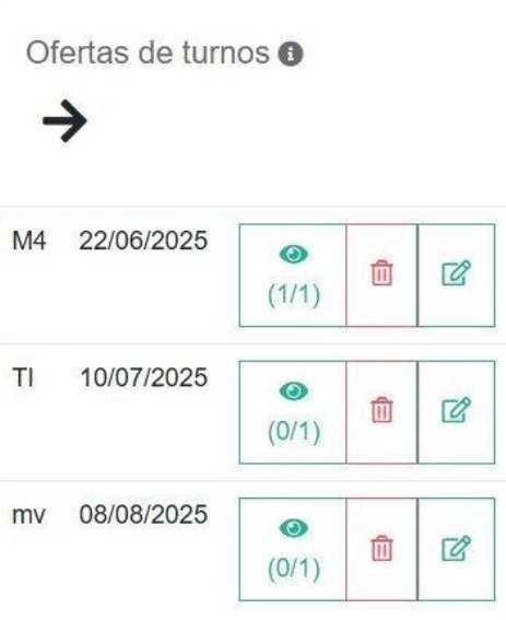 Muestra las ofertas de turnos disponibles. Los Administradores Totales y el Superusuario pueden gestionarlas por completo. Los Planificadores pueden editarlas o eliminarlas, pero no asignar turnos. Los Validadores y Trabajadores solo pueden inscribirse, descartarse y ver quiénes están interesados. Visible para: todos.