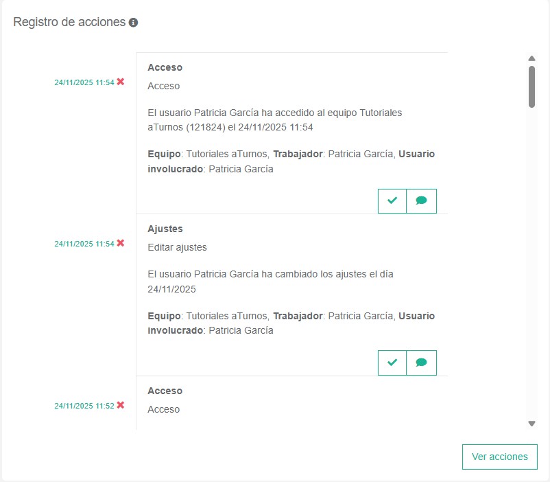 Solo se mostrarán los datos o acciones que cumplan con el filtro activado en Registro>Acciones.Para más información sobre el historial de acciones accede al siguiente enlace: Log de Acciones.
